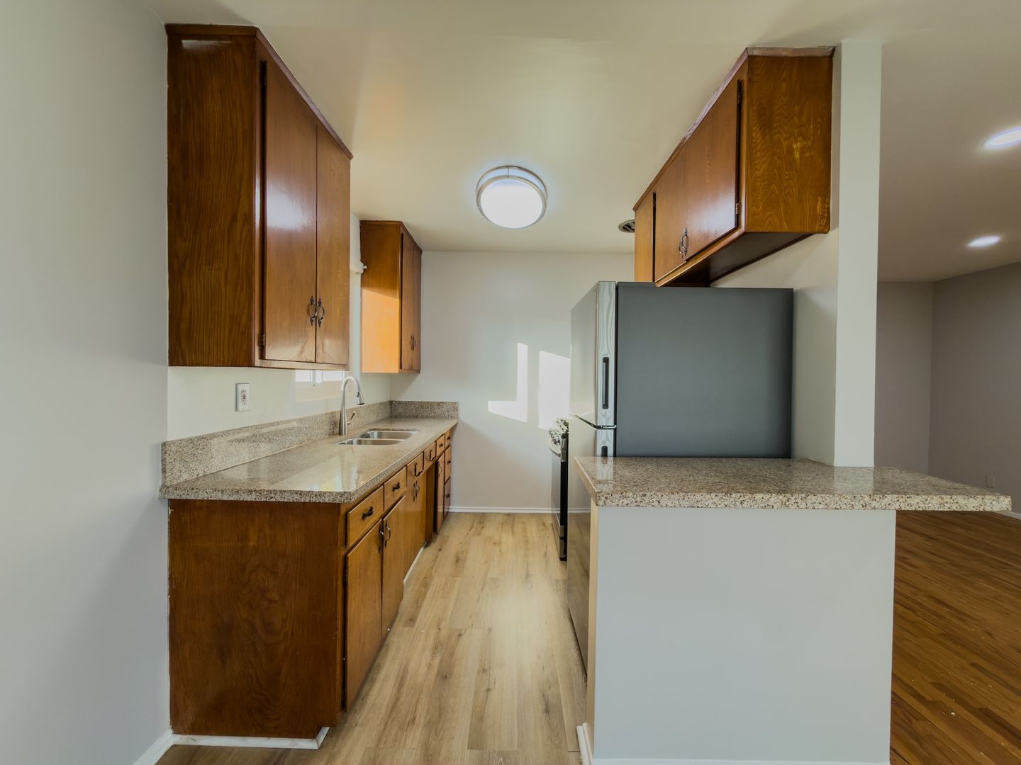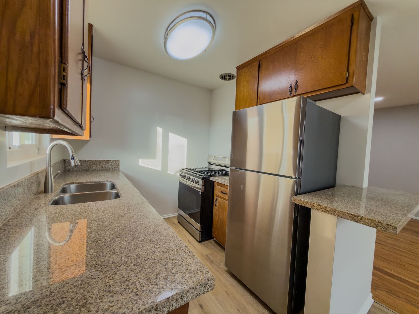 Upstairs Apartment - LARGE 2 Bedroom 1 Bath with Large Private Deck in North Torrance. Bright Kitchen with lots of Cabinet and Counter Space, Granite Countertops with Stainless Steel Sink, Stove, and Refrigerator.