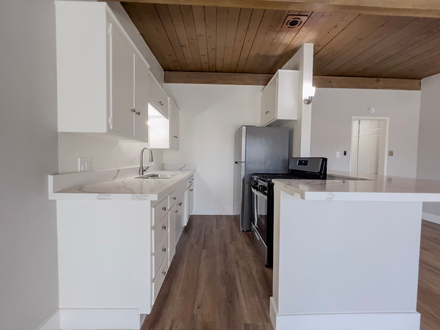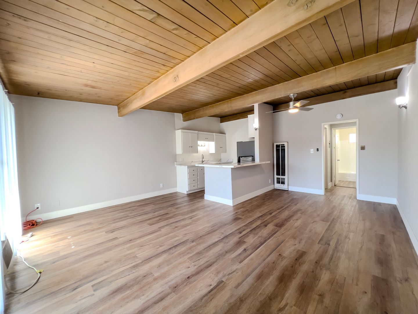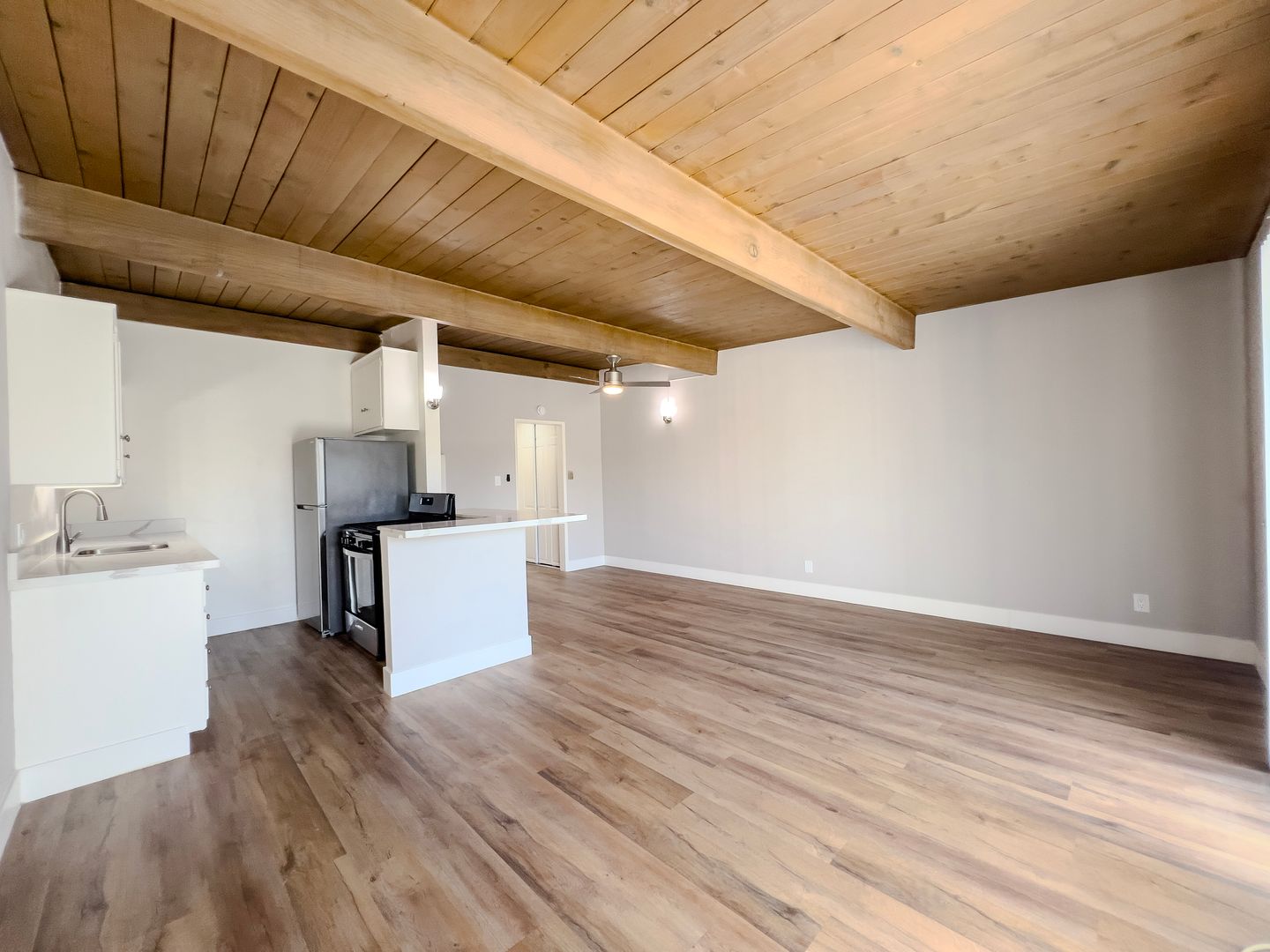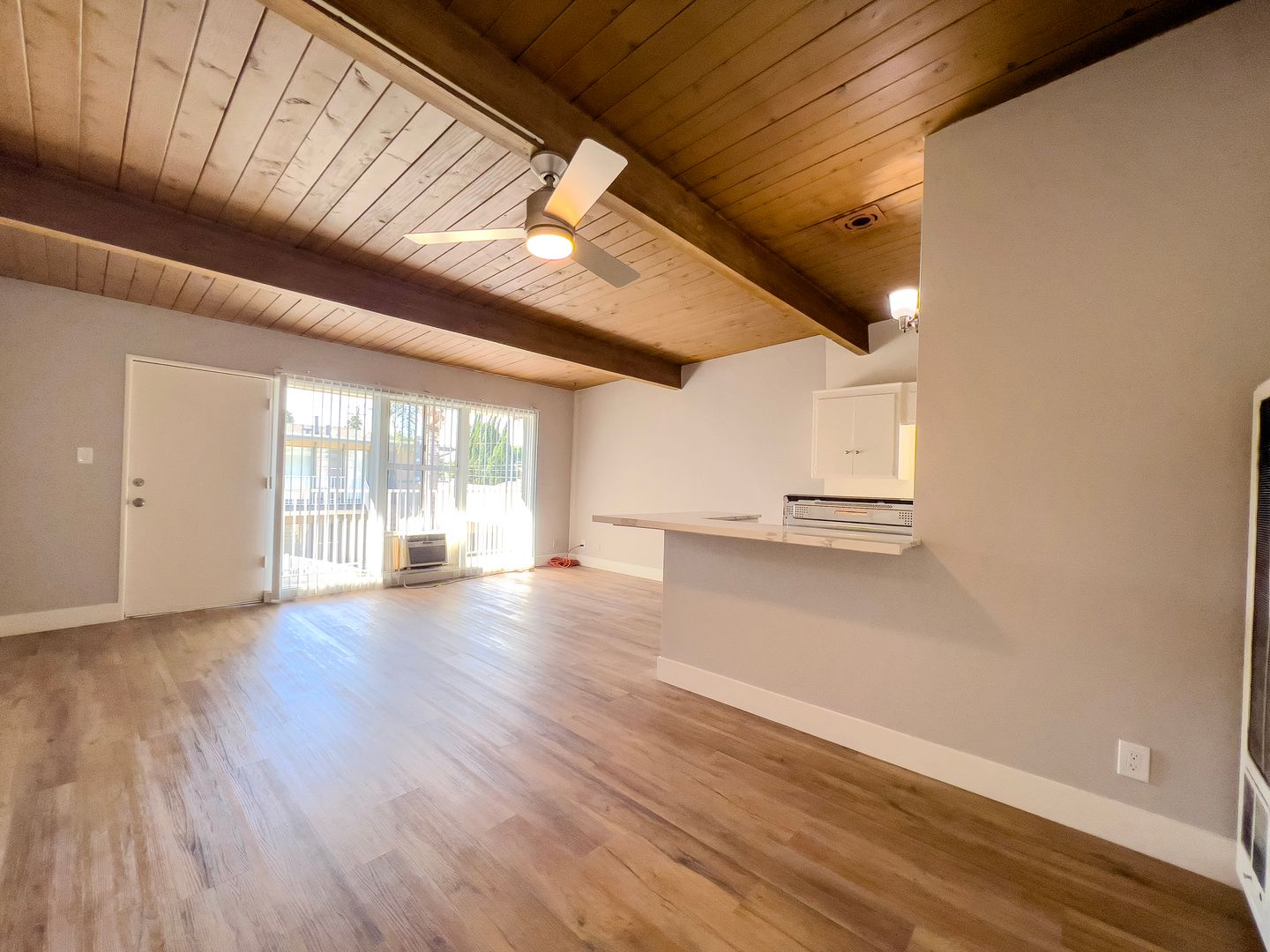 Updated! Great Upstairs Unit. Large & Bright 1 Bedroom 1 Bath. Stainless Steel Stove, Refrigerator. Open Beam Ceilings. Gorgeuos Quartz Countertops and stainless steel sink in the kitchen. Ceramic Tile Floors in the bathroom. New Gorgeous LVP Flooring throughout the unit, ceiling fans in the bedroom and dining area, window a/c units, 2 Laundry rooms in the building, we pay for water, hot water. **** NO PETS*** . Enjoy your time by the swimming pool. Close to Long Beach State University, across from Target, shopping, and dining.